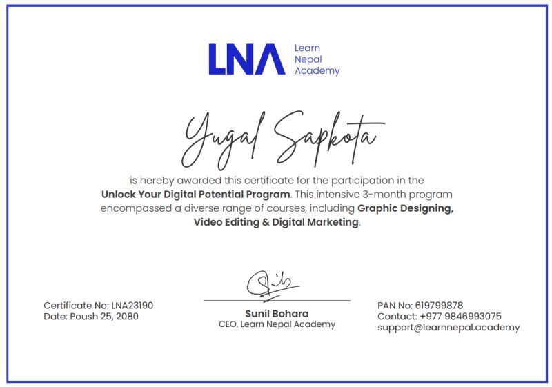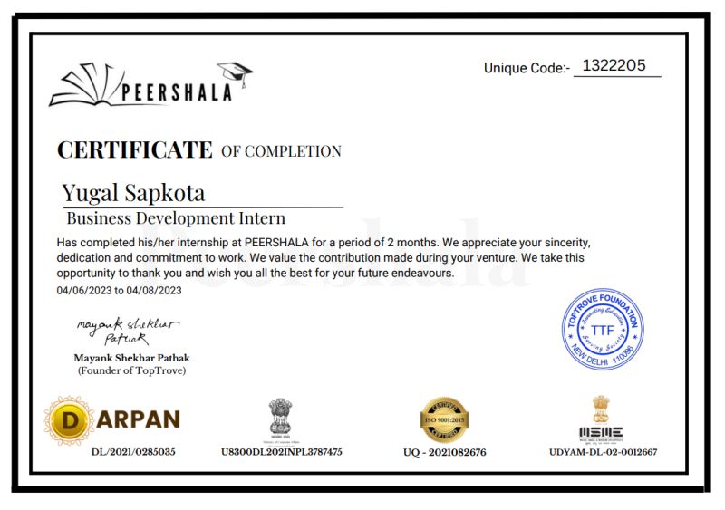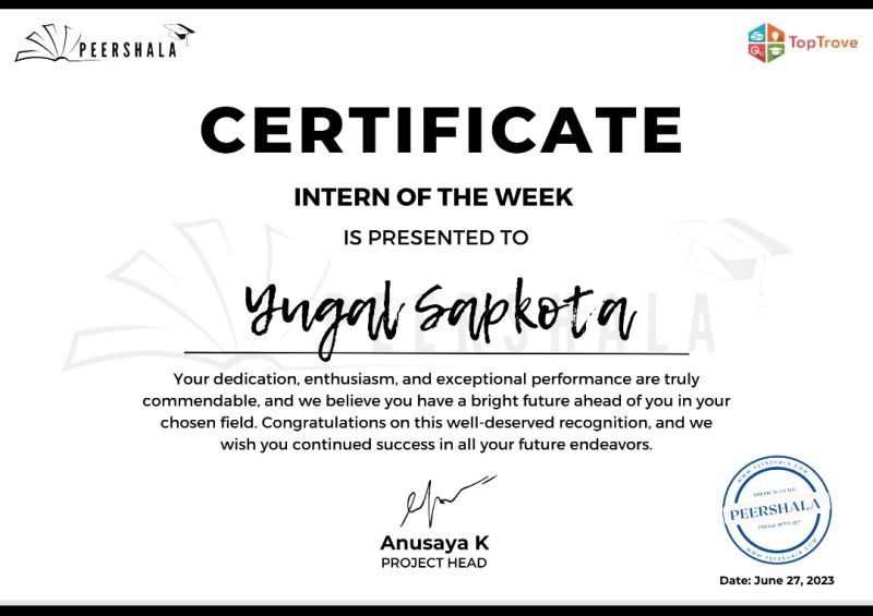 Yugal’s quest for self-improvement and growth didn’t end there. He took a step outside his comfort zone and participated in the LEO Training of Trainers Program, where he gained skills that would help him mentor and lead others. His commitment to learning and development saw him intern as a Business Development Intern at an Indian-based company. Here, Yugal was recognized as the “Intern of the Week” at Peershala, a testament to his hard work, dedication, and ability to adapt and excel in new environments.